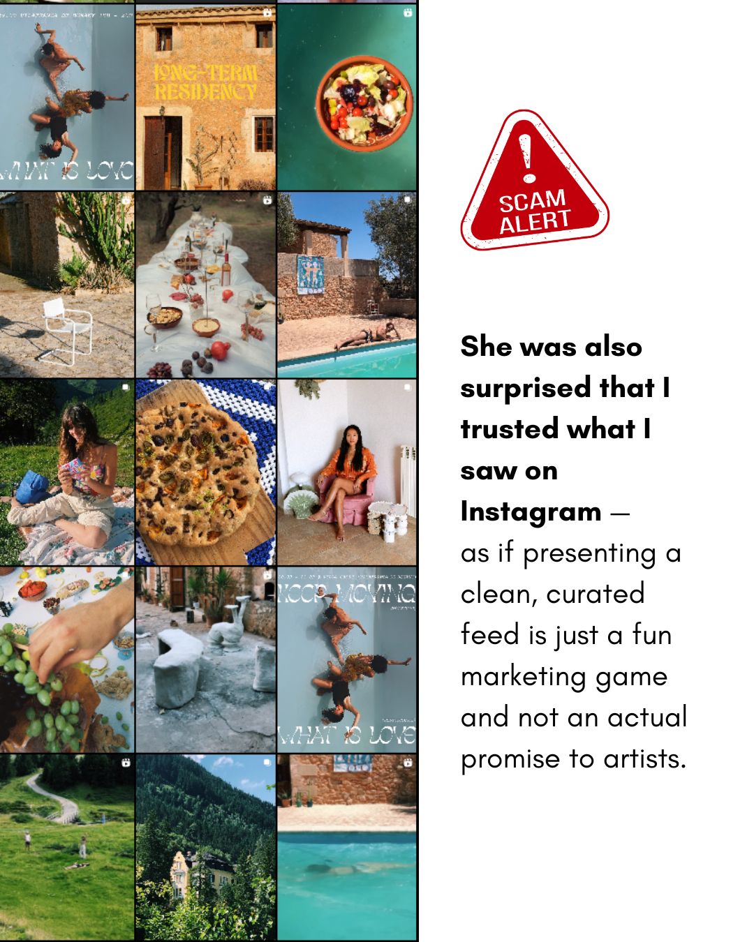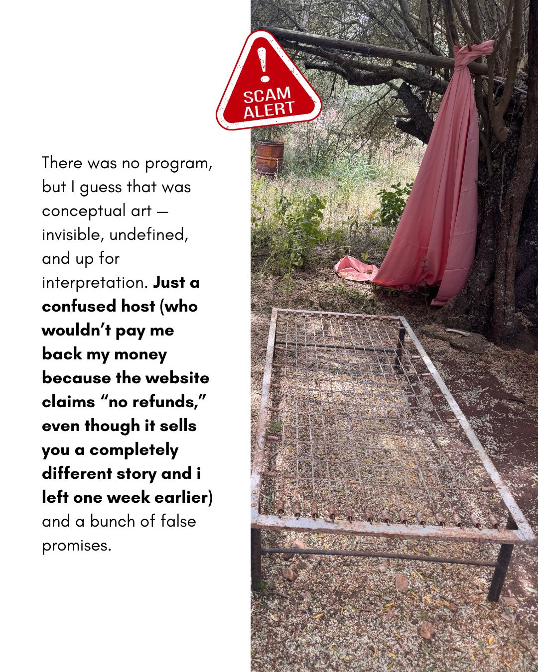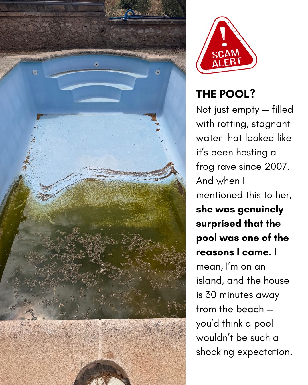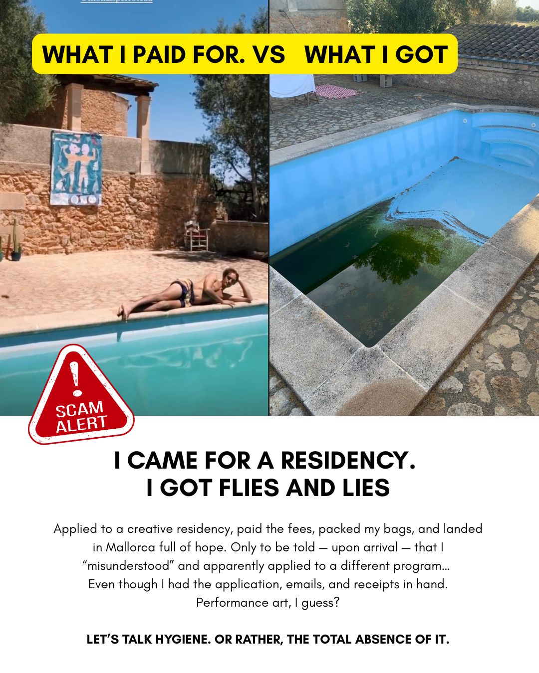 I visited Villa Capri over the last 2 years several times and can highly recommend it. Every stay was very magical and I met and connected through the residencies with so many beautiful and interesting people: local artist from Mallorca and Barcelona as well as international artists. Every time I left i felt nourished and recharged and was able to develop new ideas and try out different artistic experiments. The house is and old farm house with a beautiful pool and in the garden is a dream for every forager, so many edible plants that one can cook with everyday. over the years I tried out many different recipes, for instance: nopal lemonade, nettle soup, wild mustard pesto, wild asparagus salad. it is well located in the middle of the island so one can easily explore it with the car. the sunsets in this rural part of Mallorca are stunning and quite often there are sheeps grazing on the territory which creates a beautiful soundscape and a very idyllic vibe, especially in the morning or golden hour. Lorena is a very calm, intelligent and special person, she doesn't try to push one into a certain structure but lets the structure emerge in the process of the group. I never had a bad experience there, apart from the time the previous reviewer was present, unfortunately she was disappointed because she expected something else and wanted every other resident to suffer with her, everyday she was shouting (maybe as well mental health problems) and created a uncomfortable time for the other people in order to pressure Lorena to refund her, that was very ugly, selfish and mean of her and every one was happy when she finally left. If u are looking for a luxury resort with workshops that you just need to attend then you should go somewhere else. The experience in this residency is more empowering and participatory, the residents organize themself the workshops and plan excursions together. Like this one can peek into other disciplines and get to know some magical spots on that beautiful island, like secret beaches, limestone caves, mountain trails, sustainable projects and inspiring art exhibitions.